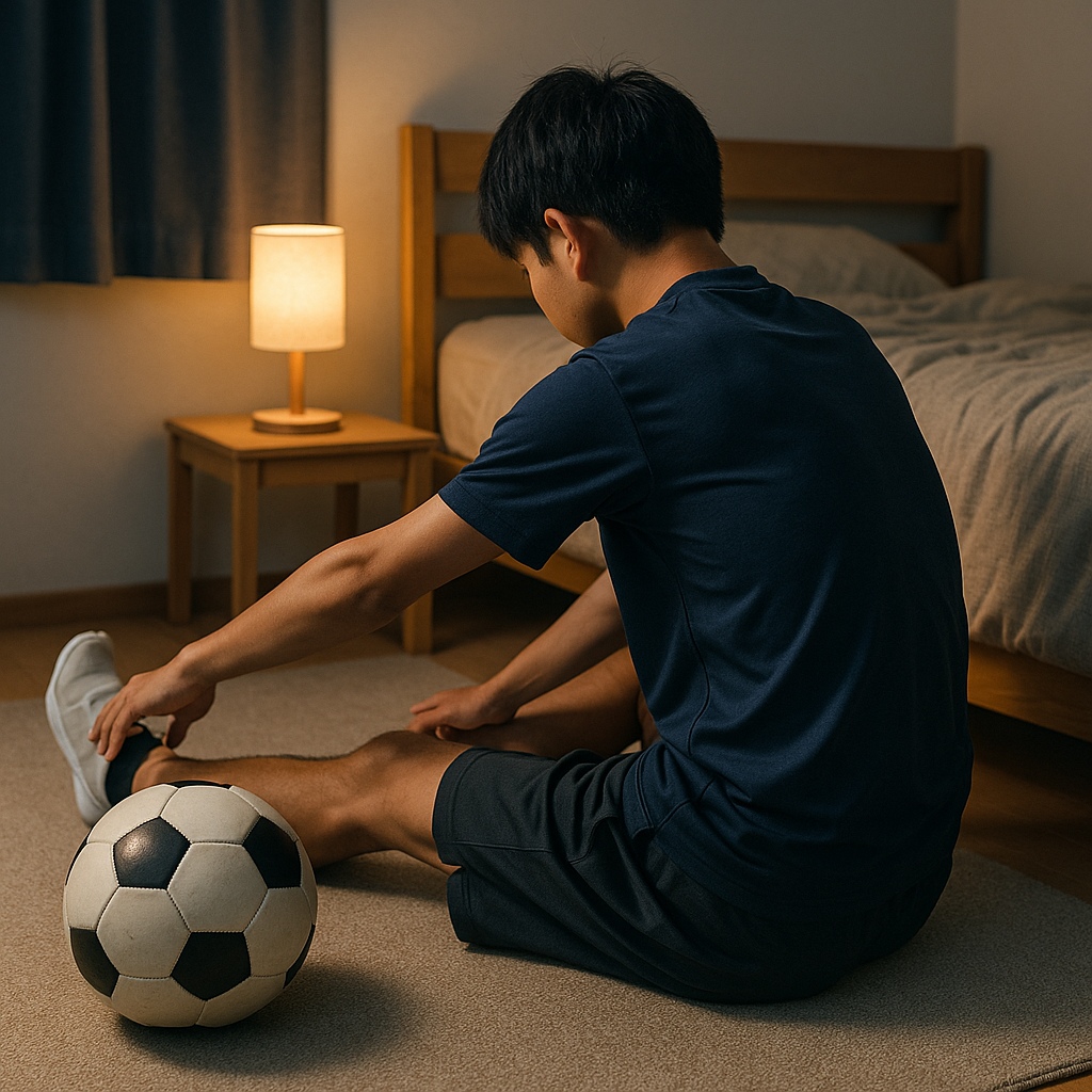 スプリント、切り返し、キックでハムストリングス、ふくらはぎ、腸腰筋、臀筋、内転筋には反復ストレスが蓄積。さらに判断負荷や遠征移動で中枢性の疲労も重なります。就寝前は「張りやすい筋の長さを適度に戻す」「神経の興奮を落とす」の二本柱で攻めるのが実用的です。