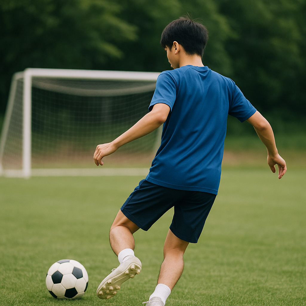 強い方の足で作った“軸足角度メモ”を左右対称にコピー。スローで形を固め、距離感(ボール横10〜20cm)を先に固定。その後にスピードを上げます。