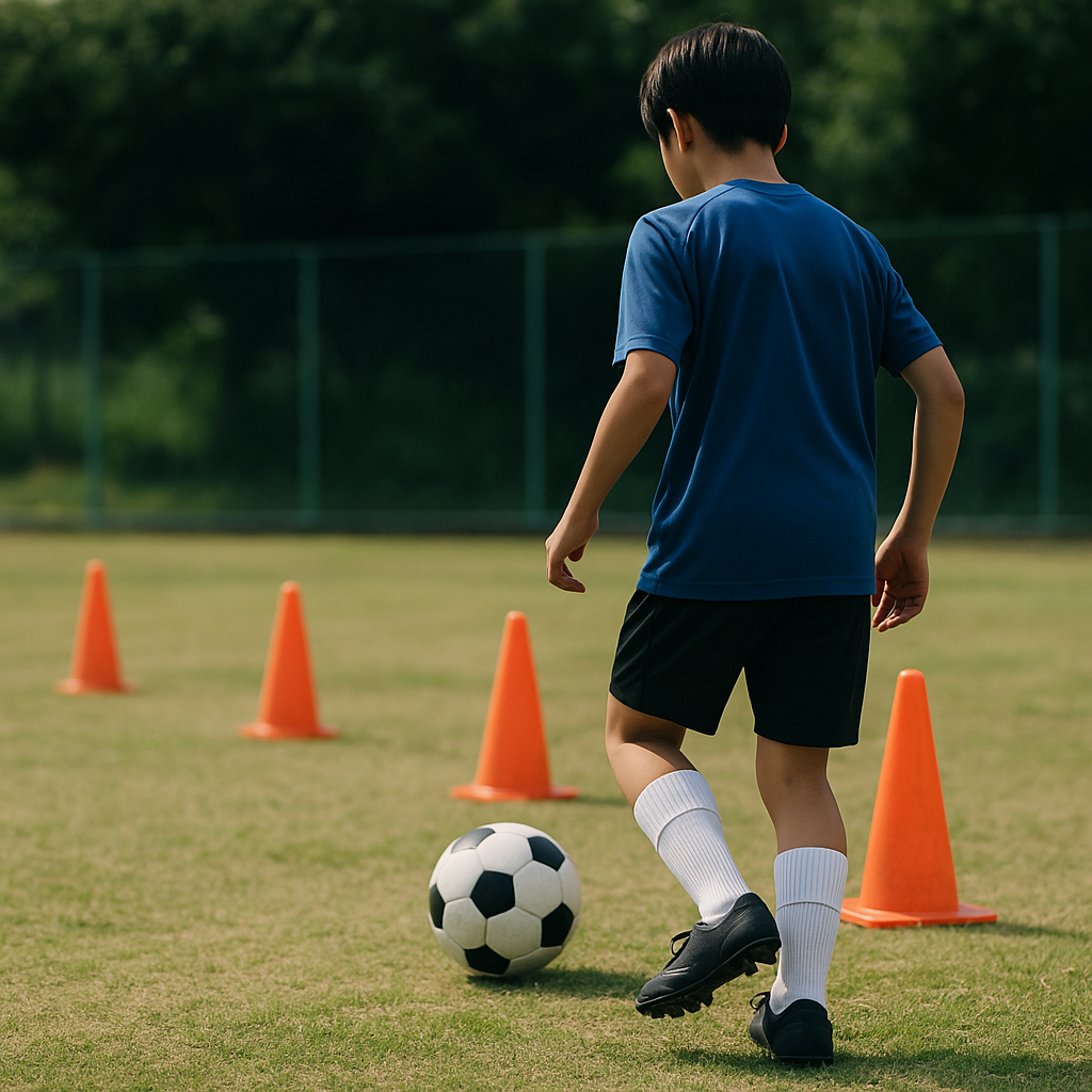 コーンやマーカーを狙点にして、対面パスかセルフトス→トラップ→パスの流れで合計を稼ぎます。目安は壁当てと同等でOKですが、移動が増える分、1セットの本数を5本減らして疲労を調整します。