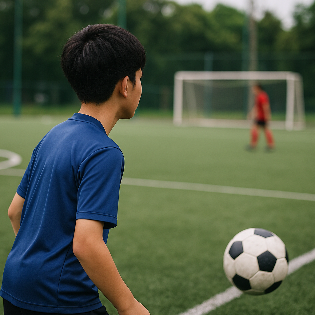 緊張で視野が狭くなります。スローインやFK前に「深呼吸→首を左右に1回ずつ→膝を軽く曲げる」のルーティンで落ち着かせます。