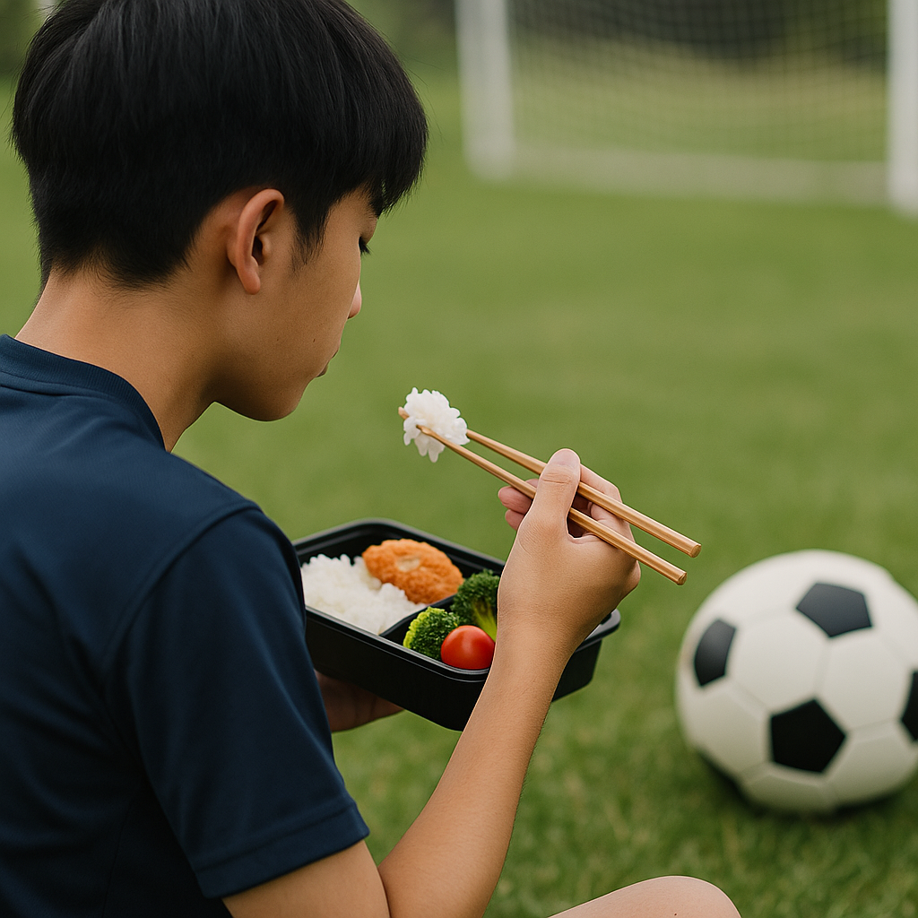 • 練習後(30分以内):1.0〜1.2g/kgの糖質で素早い回復。例:おにぎり2個+果汁100%ジュース