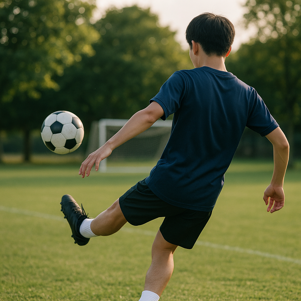 振りは股関節が主役。太ももから振り出し、膝はしなり、最後に足首。大筋群を使うとパワーと再現性が両立します。