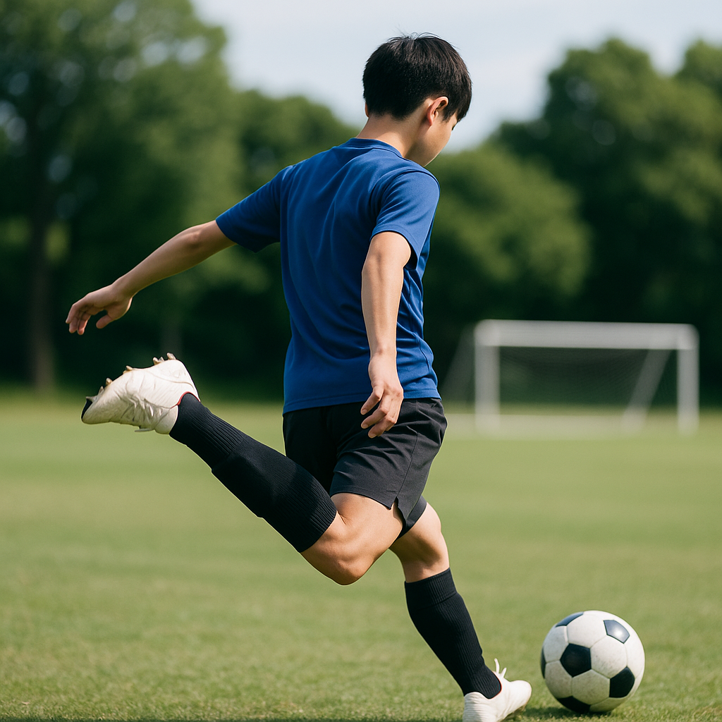 大きな距離は「地面反力」をどれだけロスなくボールに渡せるかで決まります。踏み込みで地面を押す→骨盤と体幹でひねりをためる→振り脚の付け根からしなりを使う→足首で逃がさず当てる→ボールへ。どこかで力が漏れると距離は落ちます。特に軸足が不安定だったり、足首が緩むとロスが増えます。