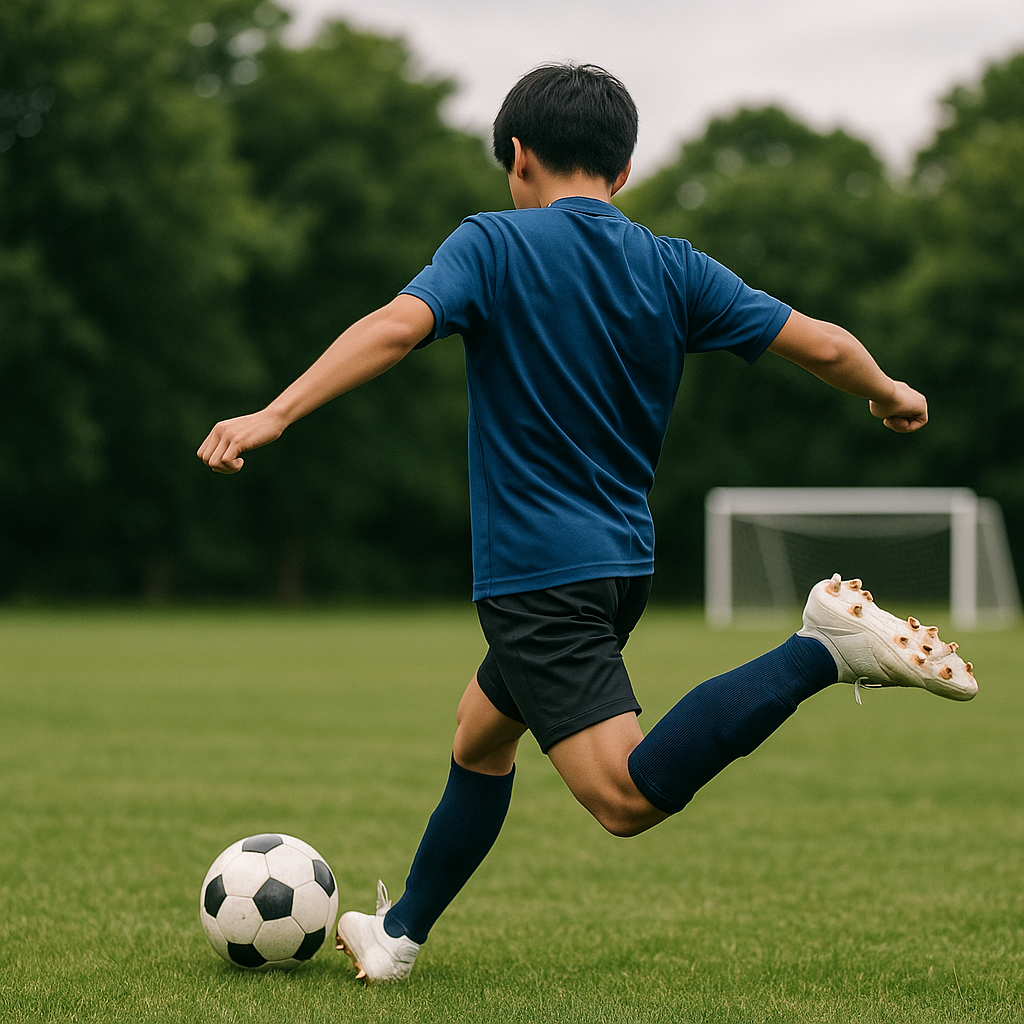 パワーは大きな関節から小さな関節へ連鎖します。股関節で骨盤を先行→体幹で遅れてついてくる→大腿→膝→足首の順番。順序が崩れると、足の振りは速く見えてもボールに乗るエネルギーは減ります。