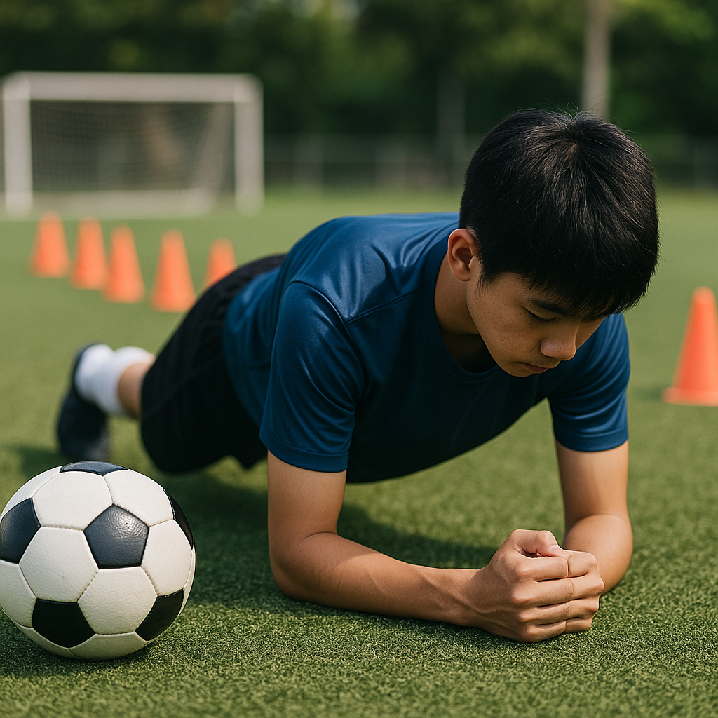 3分プランクより、30〜45秒×複数方向(前・横・回旋抵抗)で質を高める方がサッカーの動きに近い刺激になります。