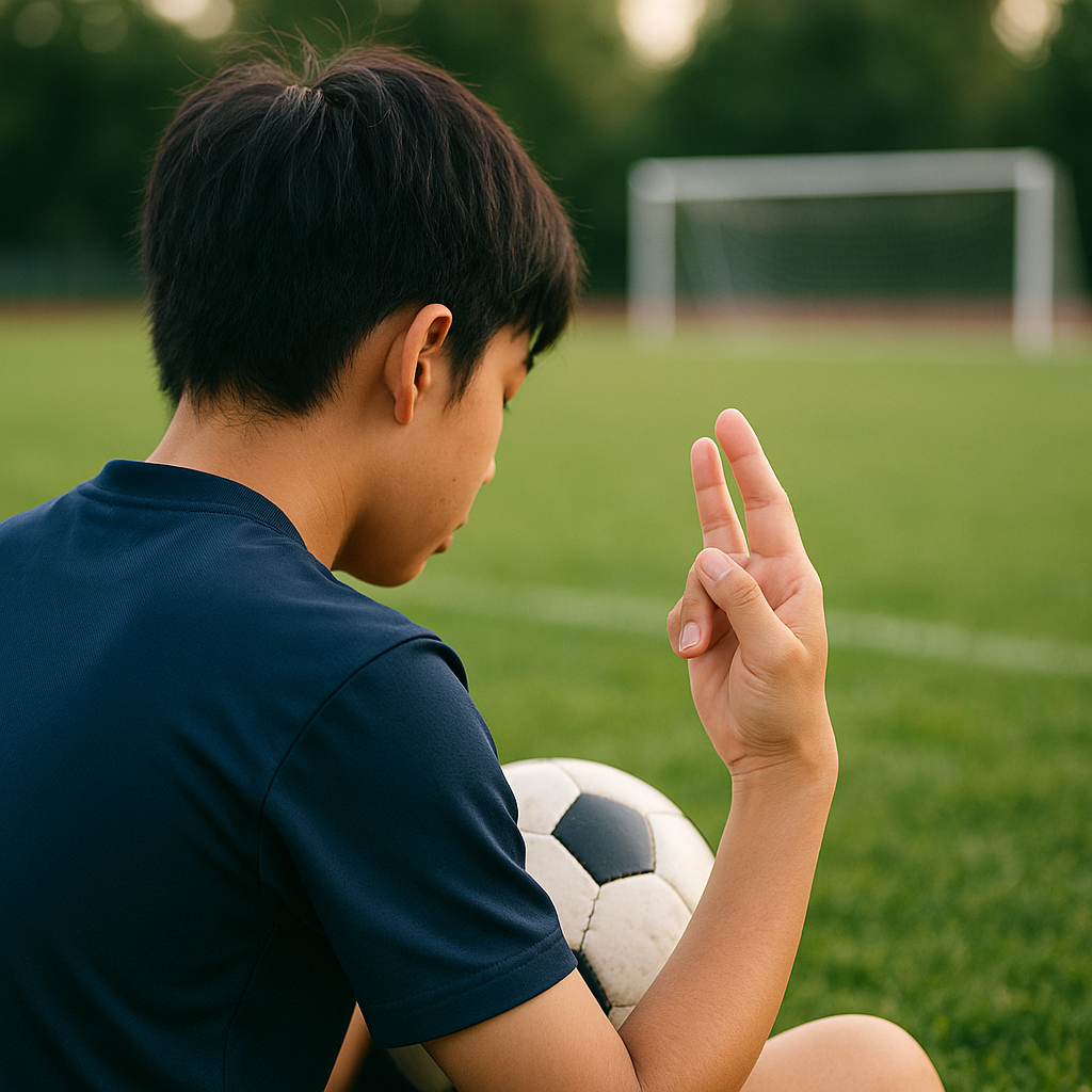 失点後に下を向きがち。保護者がタッチラインで手首タップ合図→GKはポストタッチ→4-6を3サイクル→コーチングワード3つを声に出す。泣きそうな場面でも「次の1プレー」に戻る時間が短縮。