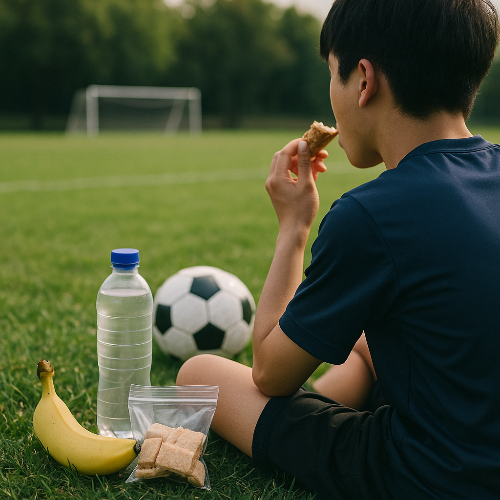 サッカーはダッシュとジョグの繰り返し。体は主に筋肉や肝臓に蓄えた糖(グリコーゲン)を使います。強度が上がるほど糖の消費は加速し、後半になると「キレが落ちる」「判断が遅れる」と感じやすくなります。さらに発汗で水分と電解質(主にナトリウム)が抜けると、痙攣リスクや集中力の低下につながります。合間の補食は、枯れかけた燃料と失われた水分・電解質を素早く補う作業です。