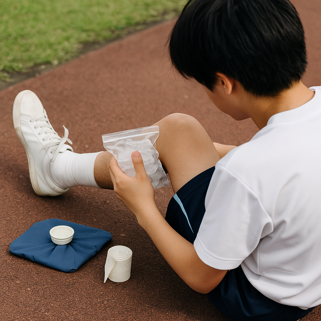 基本は同じRICEですが、成長期は骨端線(成長線)のトラブルが隠れることがあります。強い痛みや歩けない場合は早めに受診を。
