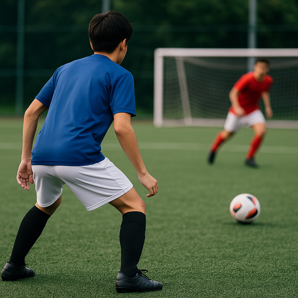 ゴール側の足をやや後ろに、半身で構えると、内側(中央)を締めつつ外へ誘導できます。軸足は滑らせず、細かいサイドステップで重心を低く。