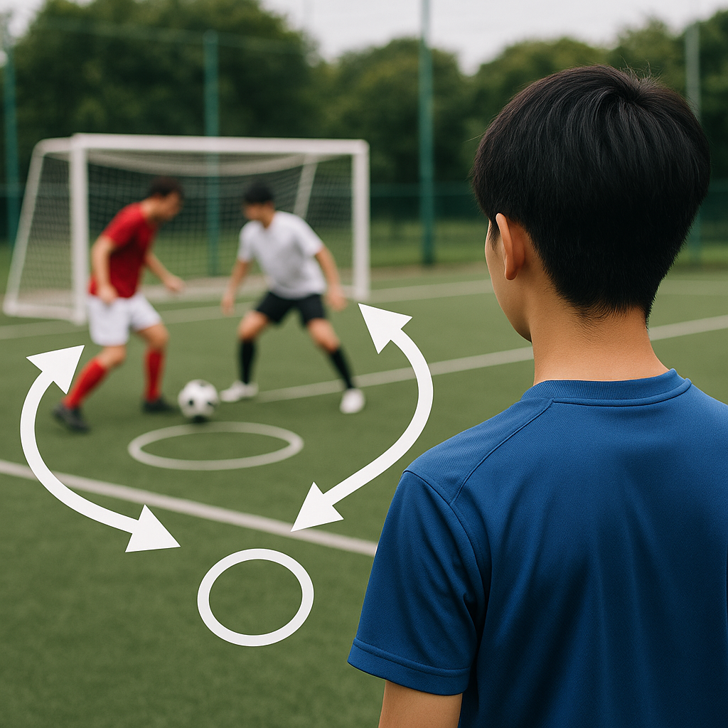 逆足の開き、助走の取り方、顔の向きがスイッチ。サイドチェンジ予兆が見えたら、逆サイドの絞りを先に完了させ、中央は“待ち”でカバー。