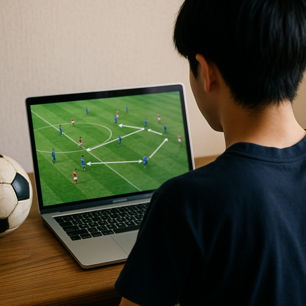 映像学習は「止める・蹴る」といった技術だけでなく、「観る(スキャン)→向く(体の向き)→選ぶ(判断)」を同時並行で磨けます。実戦の速度・密度・相手の圧力が映像にはそのまま乗るので、トレーニングだけでは得にくい「時間感覚」や「距離感」も手に入ります。