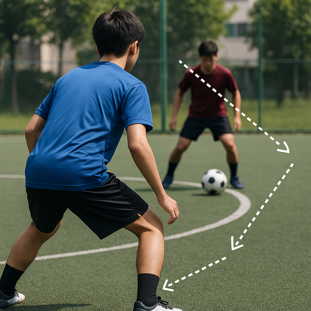 利き足側に“膝”を置くイメージでコース切り。例えば右利き相手なら、自分の左膝を相手の右足とボールの間に置き、内足で小刻みに調整。相手が中へ持ちたがるタイプなら内側の肩を前に出して壁を作る。コースを切るのは足より膝・肩・骨盤のラインです。