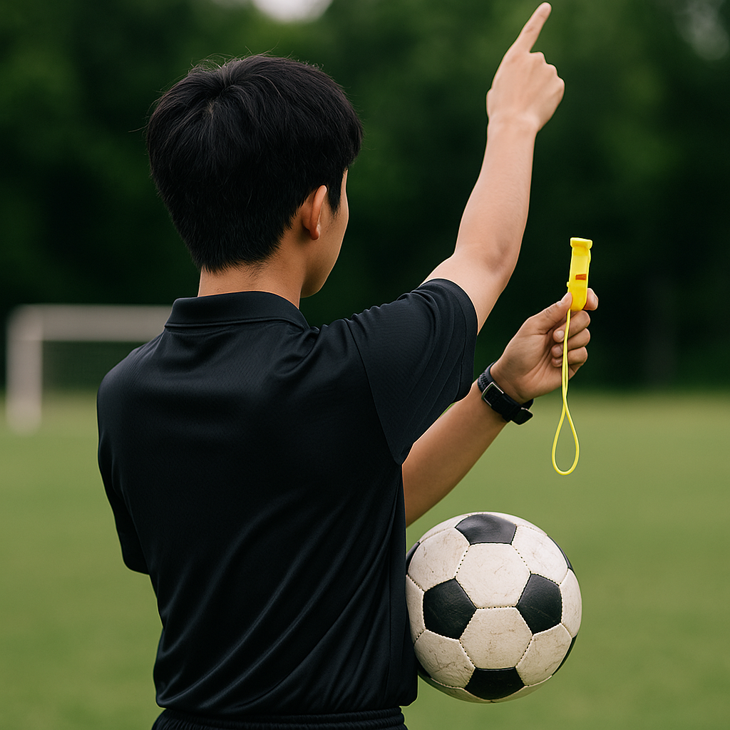 審判は反則地点を示したのち、攻撃方向に片腕を強く伸ばして直接FKを宣言。壁の距離調整が必要なら笛で管理します。