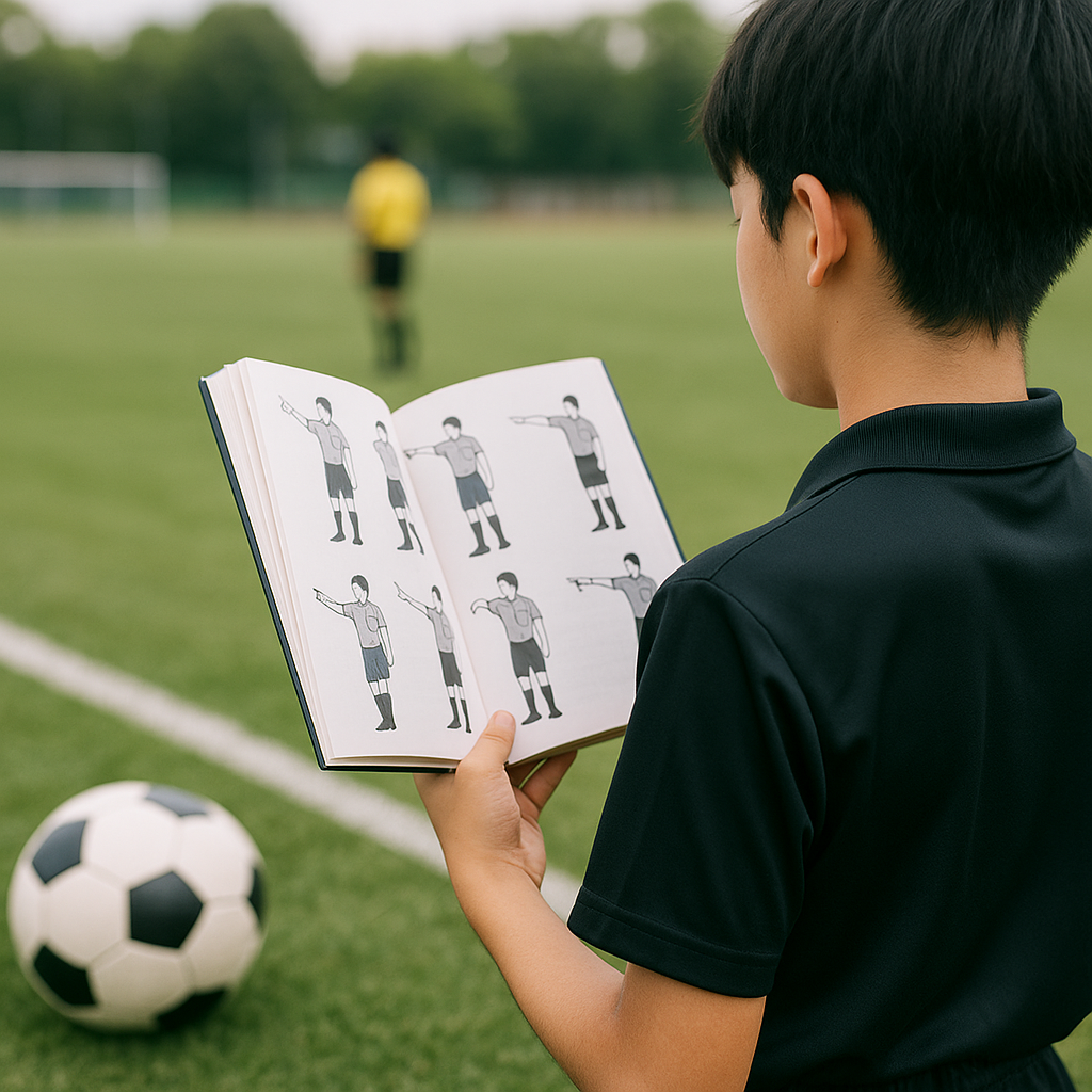 誰が(主審・副審・第四・VAR)/どこで(ファウル地点・再開位置)/何を(FK・PK・スロー)/どう(笛・腕・旗・ボード)をセットで把握しましょう。