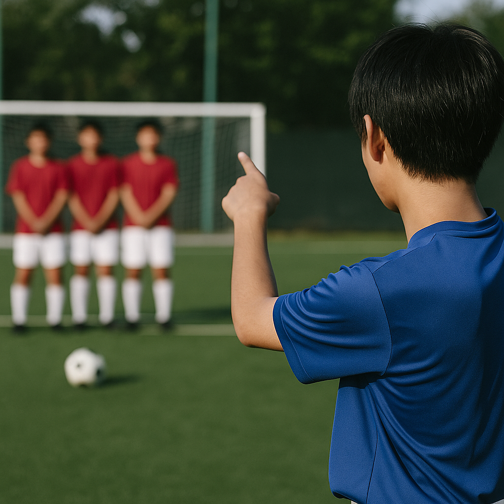 最後の3秒でGKが「右半歩」「左半歩」を明確に指示。壁は全員で同時に動き、覗き窓を固定してから静止。ここから先の自己判断移動は禁止。